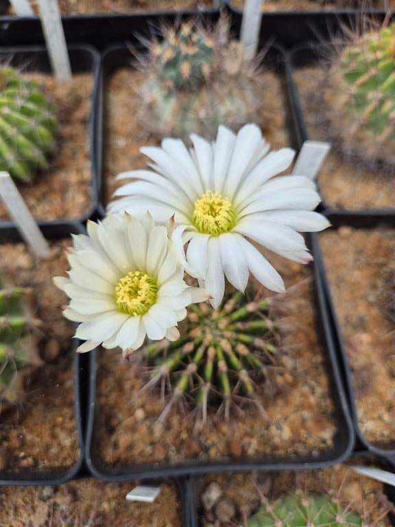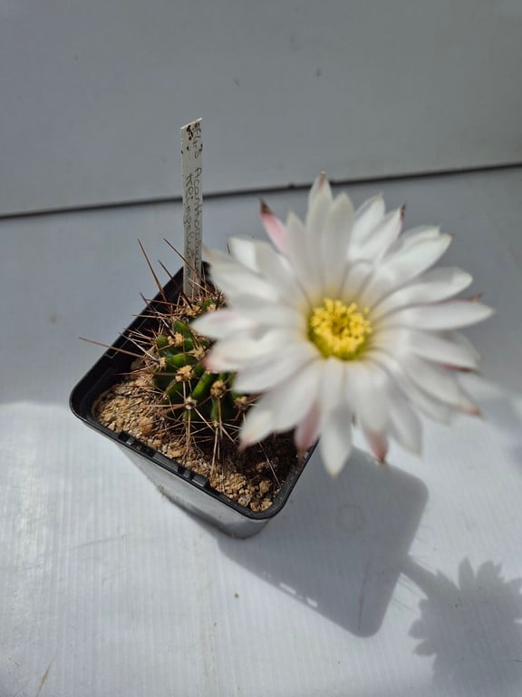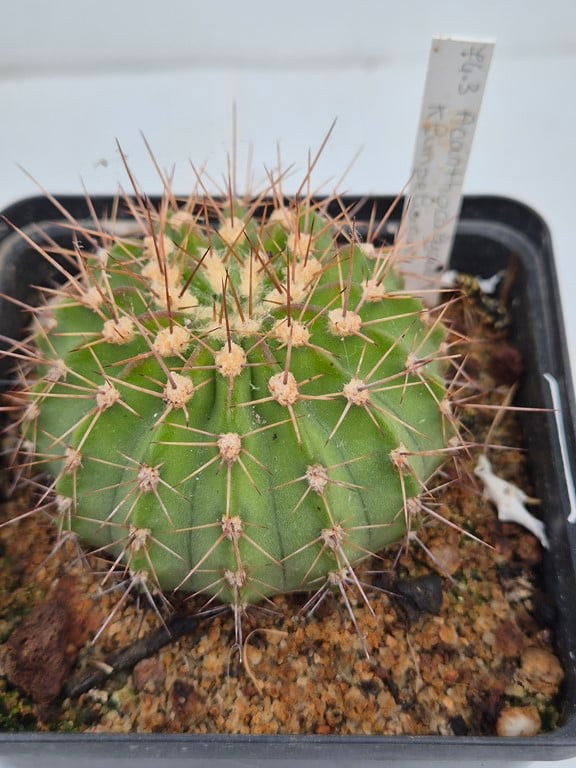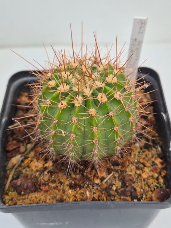Cactée solitaire globuleuse aplatie, épines grises et aux extrémités brun foncé, pouvant atteindre 10 cm de hauteur et 10 cm de