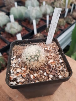 Petit cactée solitaire devenant cespiteux avec l'âge, atteignant 6 cm de hauteur et 5 cm de diamètre, recouverte de fines épines de couleur jaunes blanchatres.