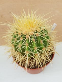 Cactée globuleuse, pouvant atteindre 1.30m de hauteur pour 1 m de diamètre, épiderme vert pâle recouvert d'épines jaune d'or. Fleurs jaunes de 5 cm de diamètre